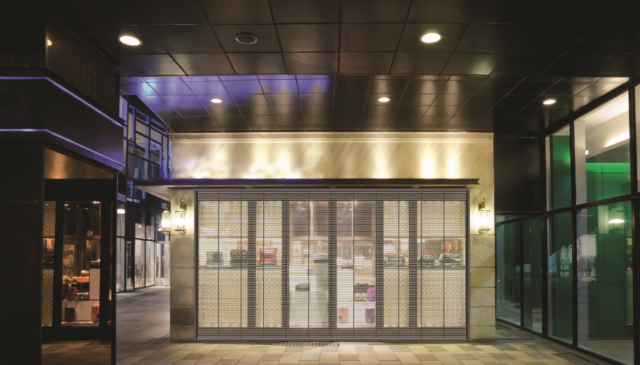 Even heavy-duty rolling doors used to protect the glass storefront of the dispensary and prevent intruders from entering the building’s dock area can be hidden when not in use. If building code allows, architects may specify a rolling door that coils up into the door’s header, residing behind an exterior soffit. These robust security doors’ lift-resistant bottom bars also can be obscured from sight.